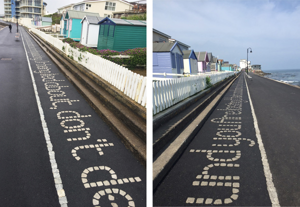 The installation of the poem began with Devon & Cornwall Surfacing carefully marking up the site to ensure that the letters would sit correctly on a straight line. Following the guide sheet drawn up by Jobling Purser, DCS began by laying out each letter using a combination of the square and inner dovetail Quicksetts. Once content with the shape of the letter, they marked around the area and removed the Quicksetts noting their position and spacing.